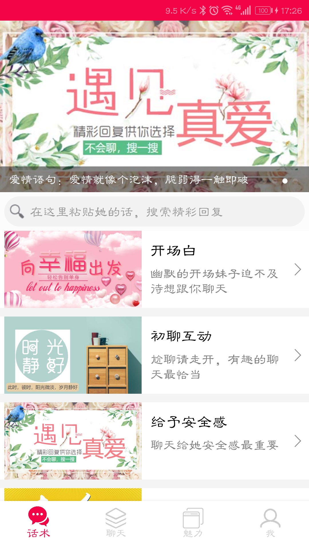 爱恋爱聊天话术app是一款专为恋爱沟通而设计的专业聊天话术软件,内含海量的恋爱聊天技巧和土味情话,让你轻松摆脱尬聊,畅快聊天,轻松追到妹纸。如果你对提升自己的社交技能感兴趣,千万不要错过这款应用,快来下载体验吧!